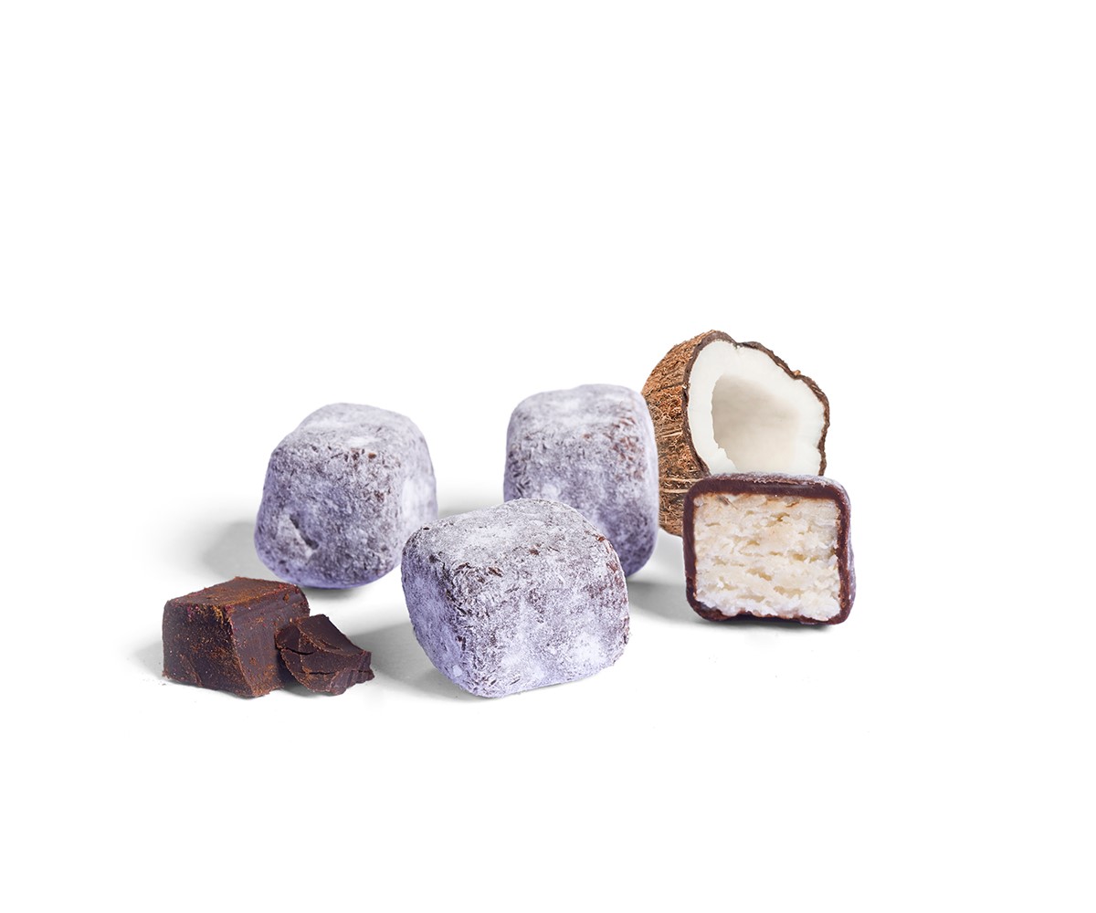 Daus de coco natural deshidratat recobert de xocolata pura al 70% de cacau, tot això cobert de sucre glas. SENSE GLUTEN